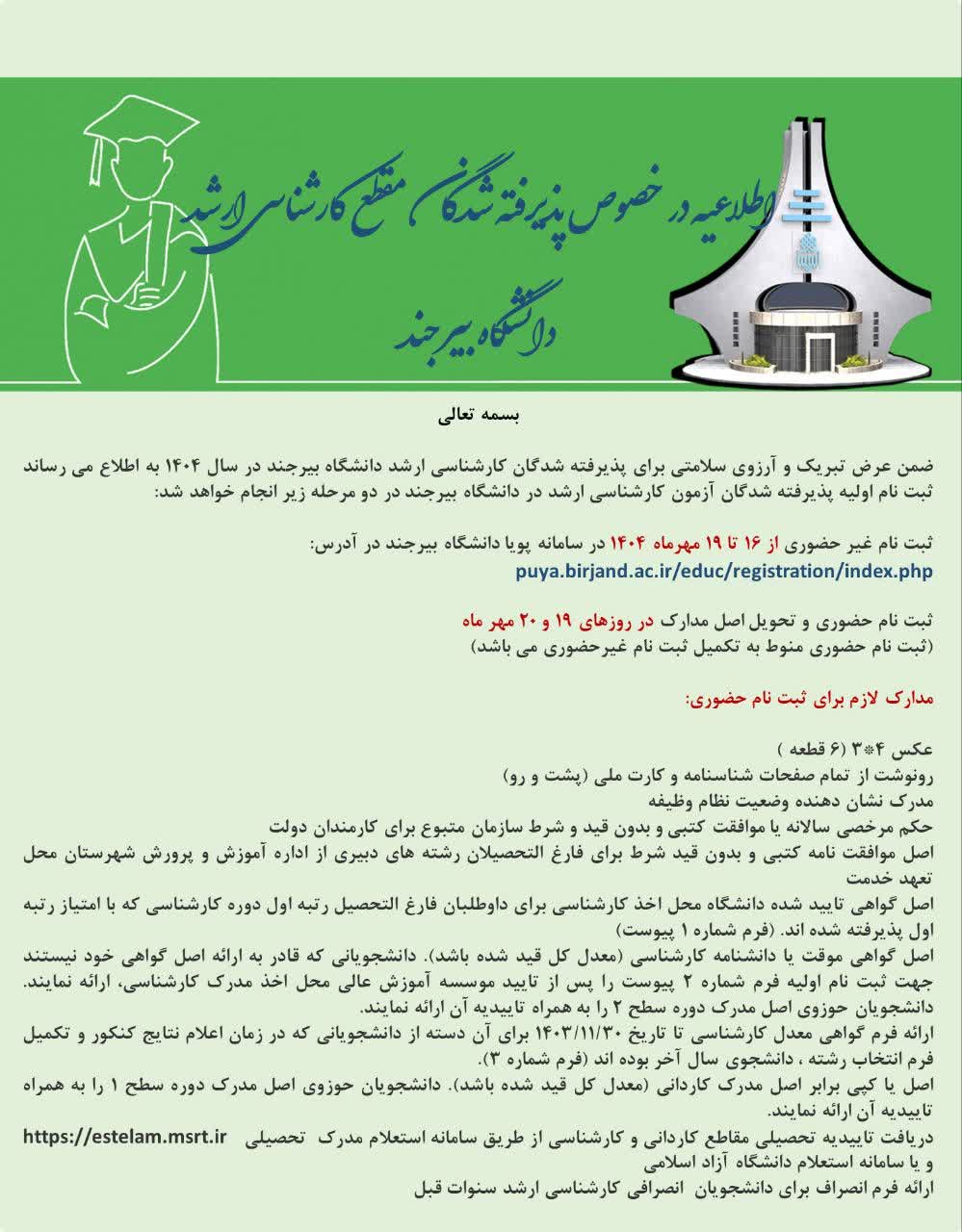 اطلاعیه در خصوص پذیرفته شدگان مقطع کارشناسی ارشد دانشگاه بیرجند ۱۵ مهر ۱۴۰۴ | ۱۳:۰۰ کد : ۳۲۰۲۸ اطلاعیه ها اطلاعیه های مهم ارسال به دیگران نام شما ایمیل شما ایمیل دریافتکننده ارسال انصراف تعداد بازدید:۹۴۳ ضمن تبریک به پذیرفته شدگان کارشناسی ارشد دانشگاه بیرجند در سال ۱۴۰۴ برای اطلاع از فرایند ثبت نام تصویر را مطالعه فرمایید.
