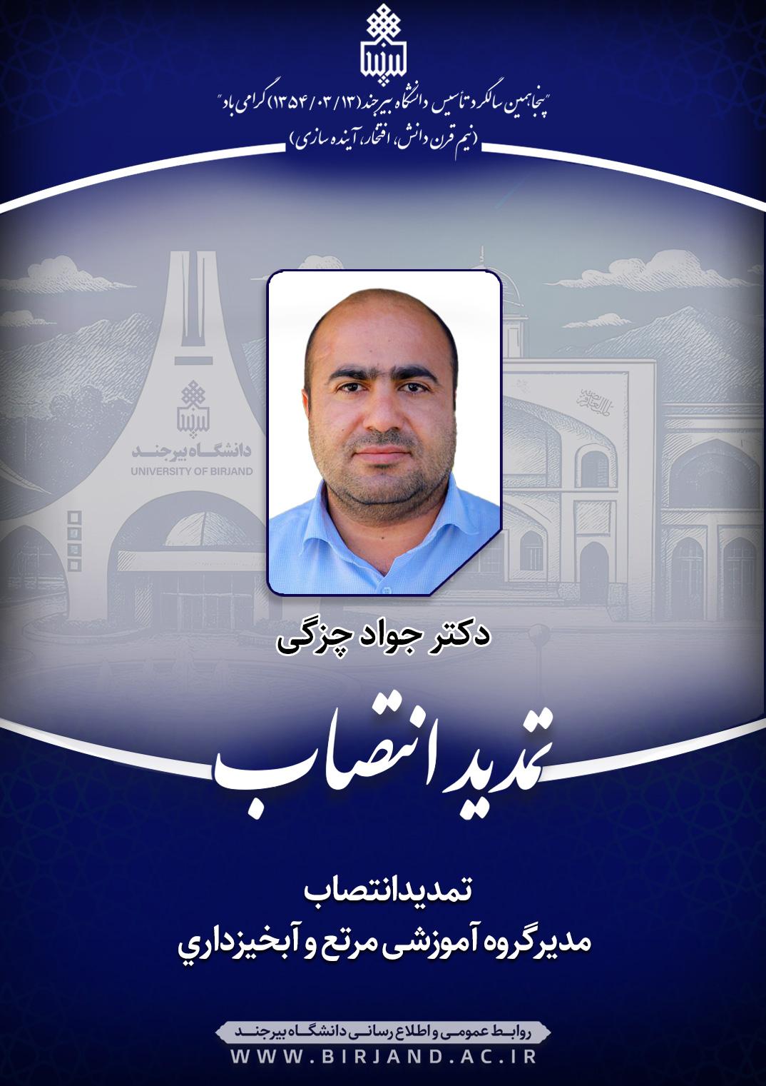 به گزارش روابط عمومی و اطلاع‌رسانی دانشگاه بیرجند، در این تمدید انتصاب آمده است؛ نظر به مراتب تعهد، تجارب و شایسـتگی‌های علمی و اجرایی جنابعالی و با تشکر از اقدامات و تلاش‌های مستمر، مثمرثمر و ارزشمند شما در دو سال اخیر، به پیشنهاد رئیس محترم پردیس علوم پایه به مـوجب این ابلاغ و بـا حفظ سمت آموزشی و پژوهشی، با تمدید انتصاب شـما در سـمت مـدیر گروه آموزشی مرتع و آبخیزداری پردیس کشاورزی، منابع طبیعی و آبخیزداری به مدت دو سال به موافقت می‌شود.