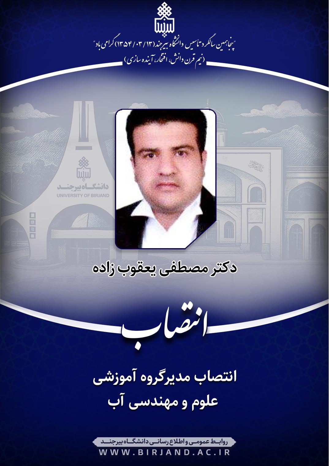 به گزارش روابط عمومی و اطلاع‌رسانی دانشگاه بیرجند، در متن ابلاغ انتصاب دکتر یعقوب زاده آمده است؛ نظر به مراتب تعهـد، تجـارب و شایسـتگی‌هـای علمی و اجرایی جنابعالی، به پیشـنهاد رئیس محترم پردیس کشاورزی، منابع طبیعی و محیط زیست، به موجب این ابلاغ و با حفظ سمت آموزشی و پژوهشی، به سمت مدیرگروه آموزشی علوم و مهندسی آب پردیس کشاورزی، منابع طبیعی و محیط زیست به مّدت دو سال منصوب می‌شوید.