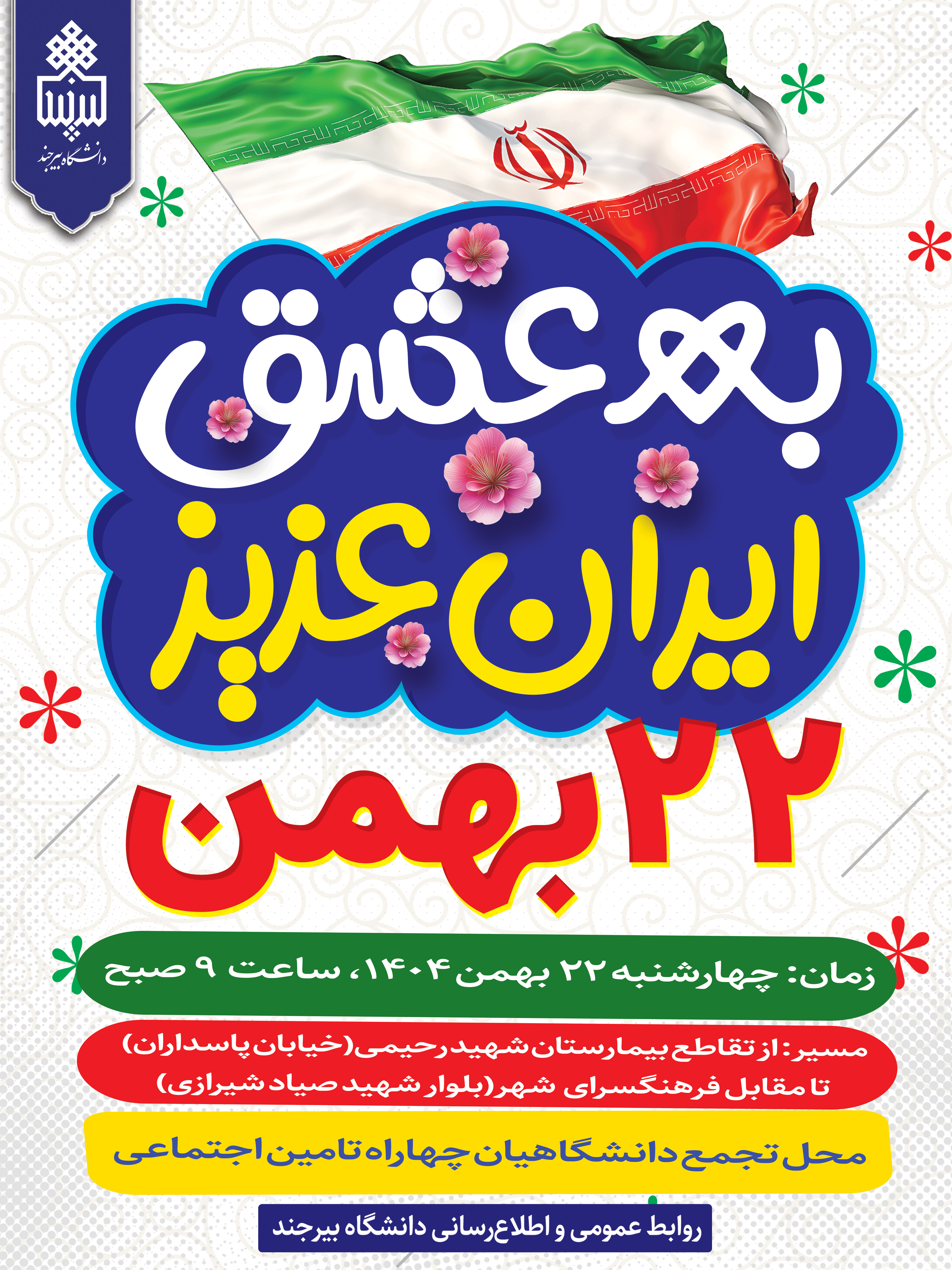 به مناسبت فرارسیدن سالروز پیروزی شکوهمند انقلاب اسلامی، از دانشجویان، اساتید، کارکنان و دانشگاهیان گرامی دعوت به‌عمل می‌آید با حضور پرشور و آگاهانه خود در راهپیمایی یوم‌الله ۲۲ بهمن، بار دیگر با آرمان‌های والای انقلاب اسلامی و امام راحل (ره) تجدید میثاق نمایند.
