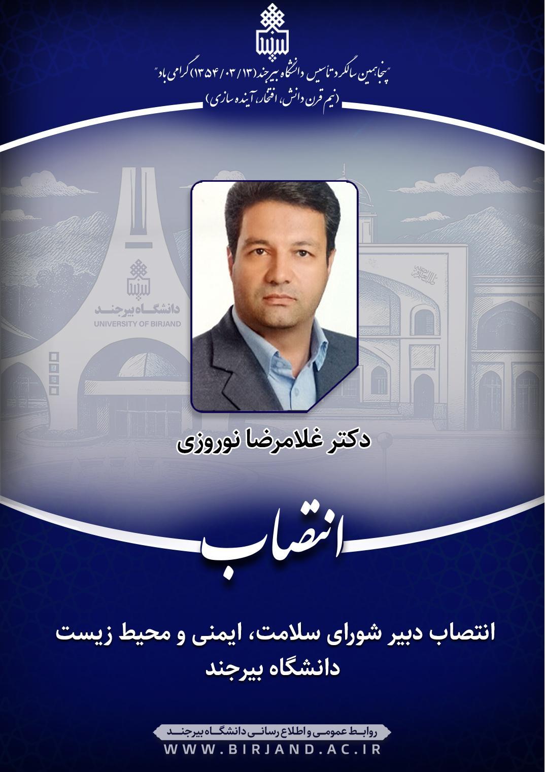 به گزارش روابط عمومی و اطلاع‌رسانی دانشگاه بیرجند، بر اساس ابلاغ صادره و با توجه به اهمیت موضوع سلامت، ایمنی و محیط زیست در محیط‌های مختلف دانشگاه، غلامرضا نوروزی استادیار گروه معدن دانشکده مهندسی، به استناد ماده (۲) آیین‌نامه اجرایی داخلی شورای سلامت، ایمنی و محیط زیست دانشگاه (مصوب صورتجلسه هیأت رئیسه دانشگاه به تاریخ ۱۳۹۸/۱۲/۲۱)، به عنوان دبیر این شورا منصوب شد.