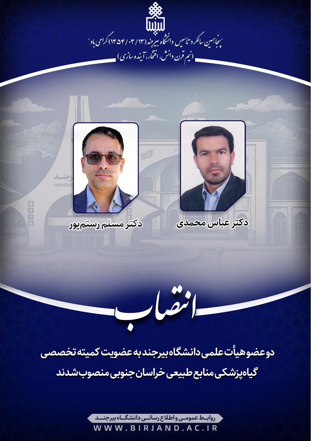 به گزارش روابط عمومی و اطلاع‌رسانی دانشگاه بیرجند، طی ابلاغ‌های جداگانه‌ای از سوی مهدی کرباسچی، سرپرست اداره‌کل منابع طبیعی و آبخیزداری خراسان جنوبی، دکتر مسلم رستم‌پور، عضو هیأت علمی گروه آموزشی مرتع و آبخیزداری و دکتر عباس محمدی، عضو هیأت علمی گروه آموزشی گیاه‌پزشکی دانشگاه بیرجند به عنوان اعضای کمیته تخصصی گیاه‌پزشکی این اداره‌کل منصوب شدند.