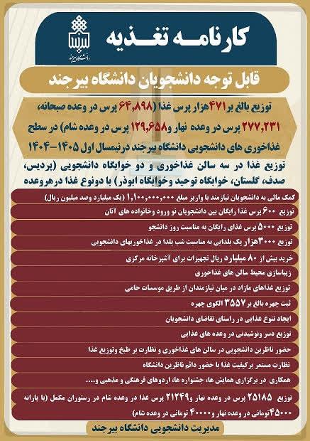 مدیر دانشجویی دانشگاه بیرجند از توزیع بیش از ۴۷۱ هزار پرس غذا در غذاخوری‌های دانشجویی این دانشگاه طی نیمسال اول سال تحصیلی ۱۴۰۵–۱۴۰۴ خبر داد؛ اقدامی که در کنار ارتقای کیفیت خدمات رفاهی، با اجرای برنامه‌های متنوع بهبود تغذیه دانشجویان همراه بوده است.